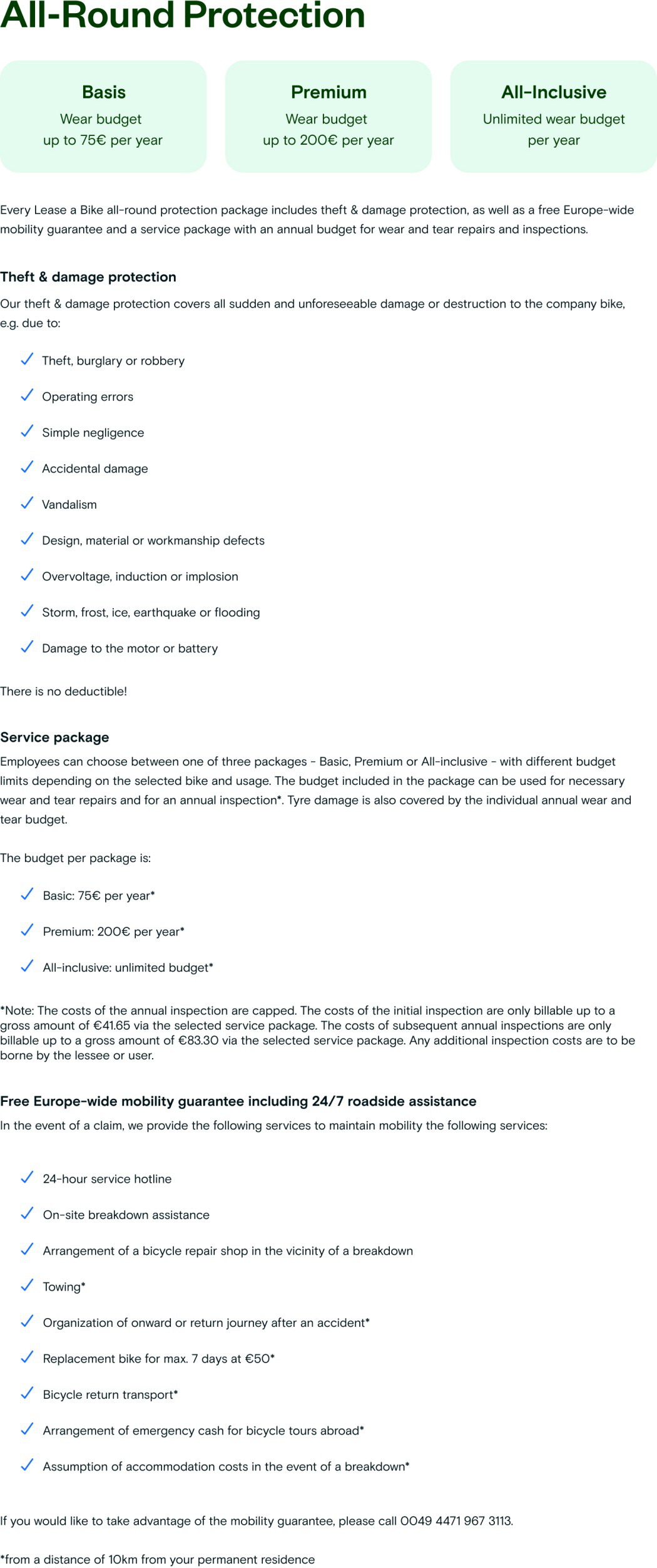 Employees receive an all-inclusive package as a comprehensive protection package, which has an unlimited budget. This covers repairs that are necessary for the operational safety of the bicycle. Tire damage is also covered by the individual annual wear and tear budget, as it is not considered an insurance claim.
